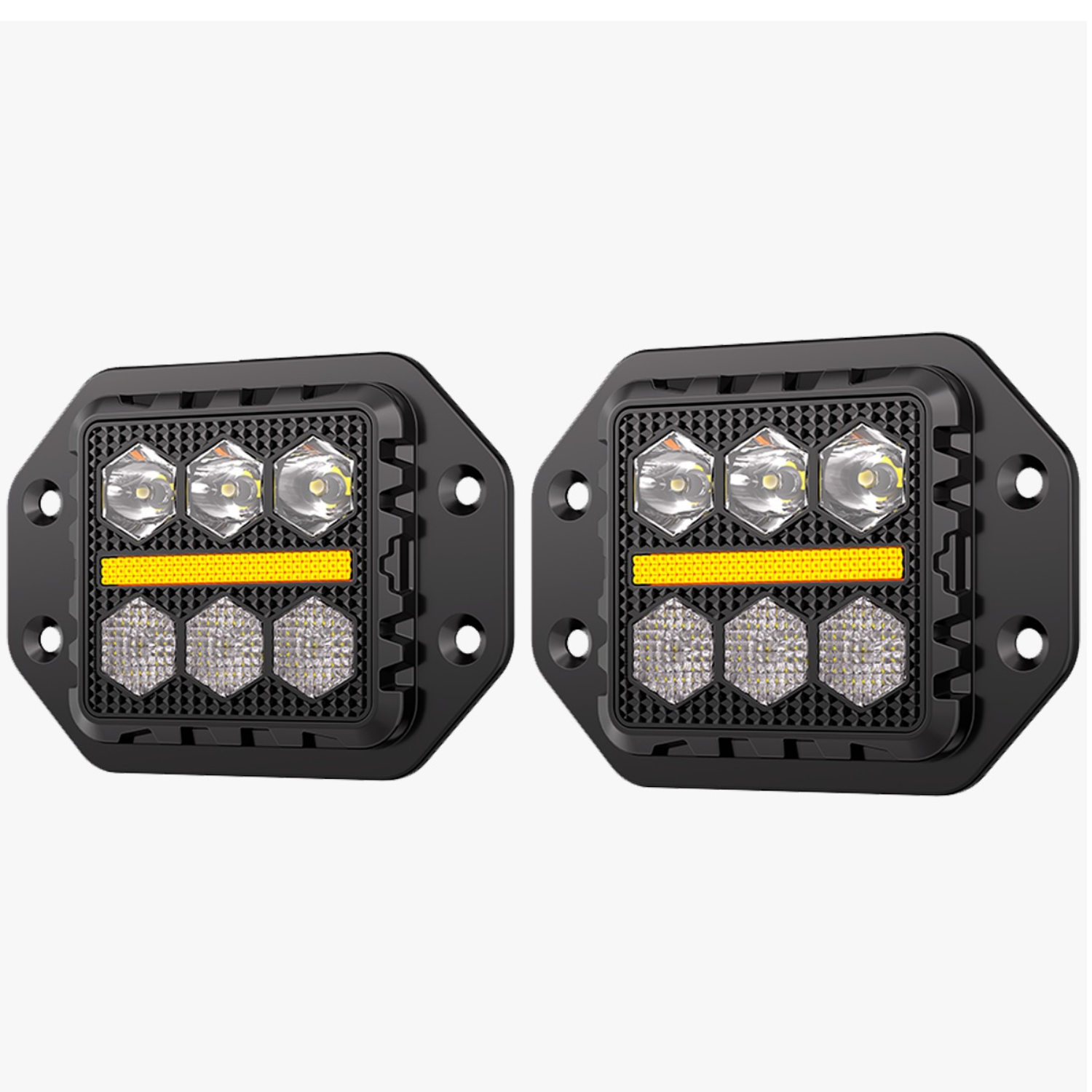 Faro LED cuadrado de 3 pulgadas empotrable de la marca Imloya, diseñado para aplicaciones profesionales en vehículos. Cuenta con luz blanca fija de alta intensidad y función de estrobo para mayor visibilidad en condiciones adversas. Incluye DRL (luz diurna) ámbar integrado que mejora la presencia del vehículo en carretera. Su construcción robusta permite empotramiento directo en parachoques o defensas. Ideal para camiones, vehículos de trabajo y aplicaciones off-road que requieren iluminación confiable y multifuncional. Modelo Pro-1011 de Imloya, referente en iluminación automotriz de calidad.